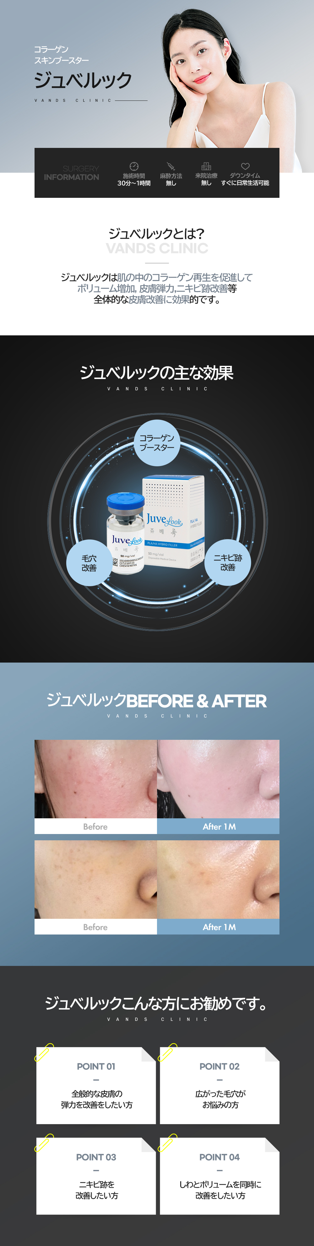 皮膚に注入された後、すぐにボリューム効果が現れる一般的なフィラーとは異なり、自己コラーゲンの生成を促進し、